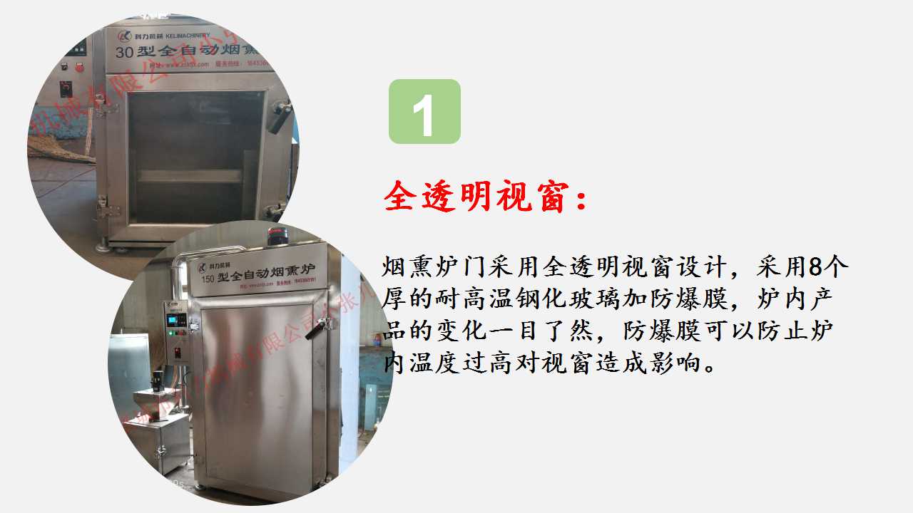 爐體是進(jìn)行煙熏上色蒸煮烘干的場所,上部有葉輪,葉輪的作用是在軸流電機(jī)的帶動(dòng)下將吸上來的熱氣、煙霧進(jìn)行擴(kuò)散,達(dá)到均勻地效果。電加熱管在兩側(cè),升溫速度快,受熱均勻。一個(gè)溫度探頭,用于測爐內(nèi)溫度外觀的幫助我們判斷產(chǎn)品的熟化狀態(tài)。爐內(nèi)兩側(cè)有獨(dú)立煙道,上部設(shè)有排氣口、排煙口,側(cè)面專門有蒸汽對(duì)流口,目的也是保證爐內(nèi)溫度、煙霧上下一致的效果,避免上下溫度不一致,煙熏色澤不一致的狀況。在爐內(nèi)的底部設(shè)有排水口,排除蒸汽遇冷凝結(jié)形成的水珠。爐體采用8個(gè)厚的鋼化玻璃貼有特制防爆膜制作大玻璃窗(150型以上采用實(shí)體不銹鋼門),可清晰觀察爐內(nèi)產(chǎn)品的加工過程及及時(shí)排除突發(fā)狀況,安全可靠。