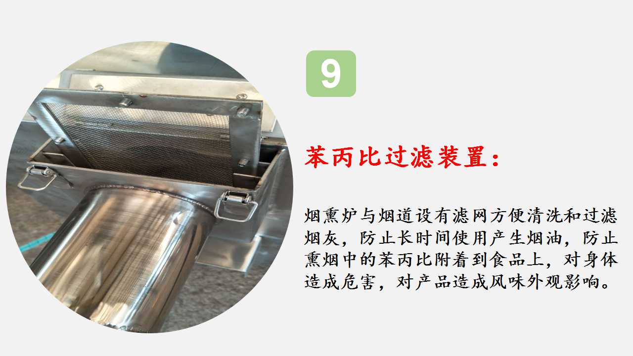 過濾板:可有效避免煙熏中產(chǎn)生的固體小顆粒、煙焦油等有害城府附著在產(chǎn)品表面。