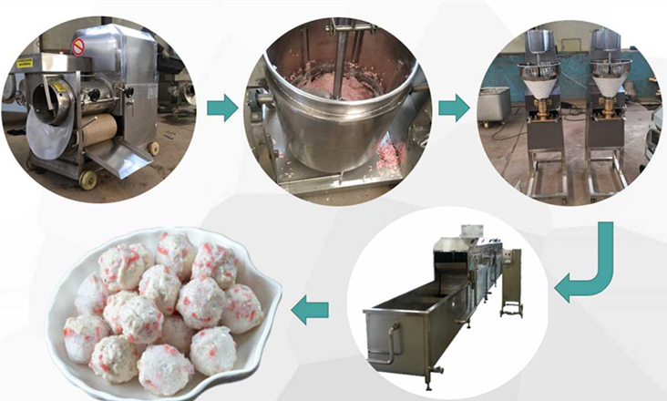 丸子成型機(jī)是肉漿成型后直接進(jìn)入蒸煮——冷卻線